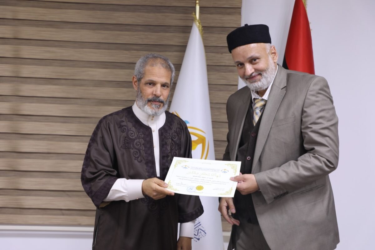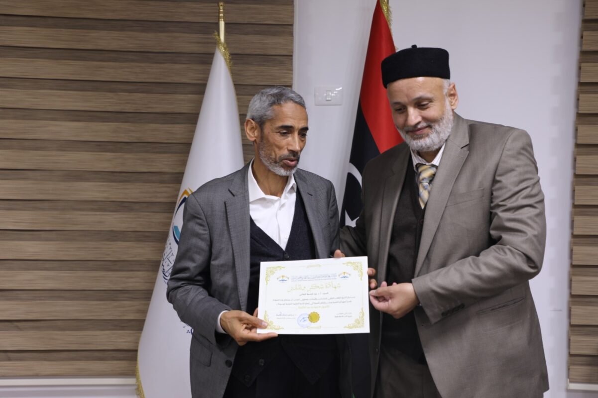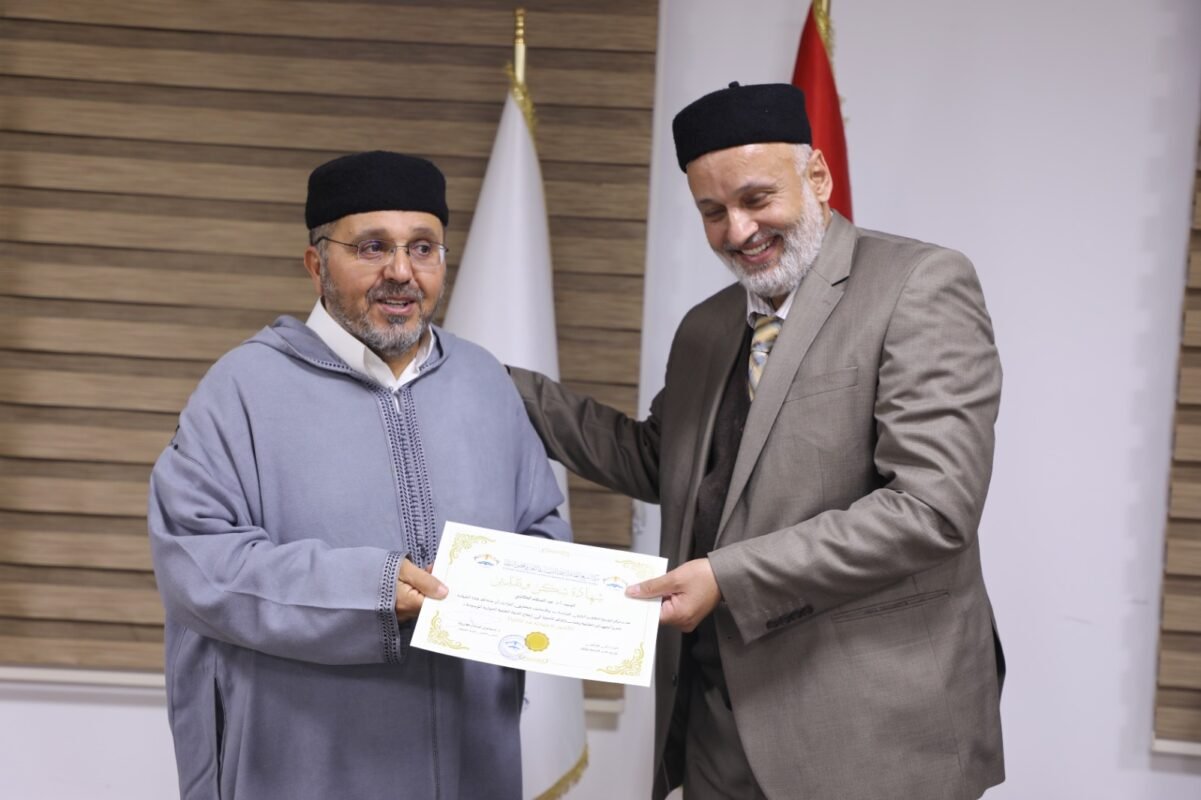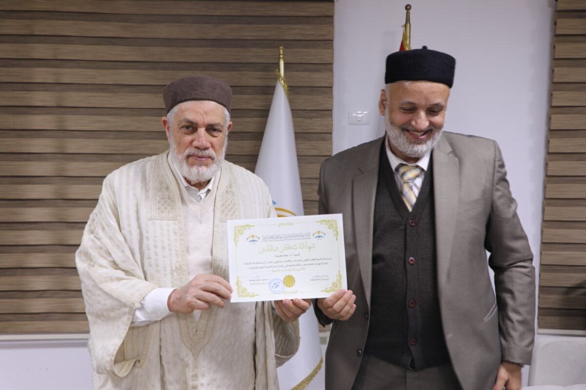 وفي ختام هذه التظاهرة العلمية الكبيرة، وتقديراً للجهود الأكاديمية المبذولة، قامت إدارة مركز الشيخ الطاهر الزاوي بتوزيع شهادات شكر وتقدير على كافة السادة المشاركين والمناقشين، عرفاناً بجهودهم العلمية ومشاركتهم الفعالة التي أسهمت بشكل مباشر في إنجاح هذه الندوة الحوارية وإخراجها بالصورة اللائقة التي تليق بمكانة المذهب المالكي، وبذكرى علم من أعلام الأمة الإسلامية.
