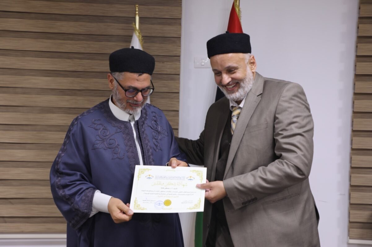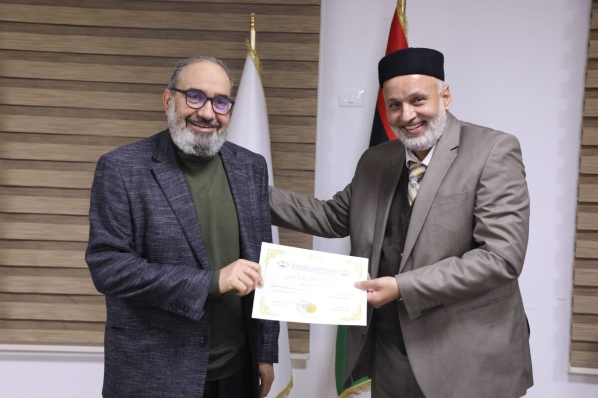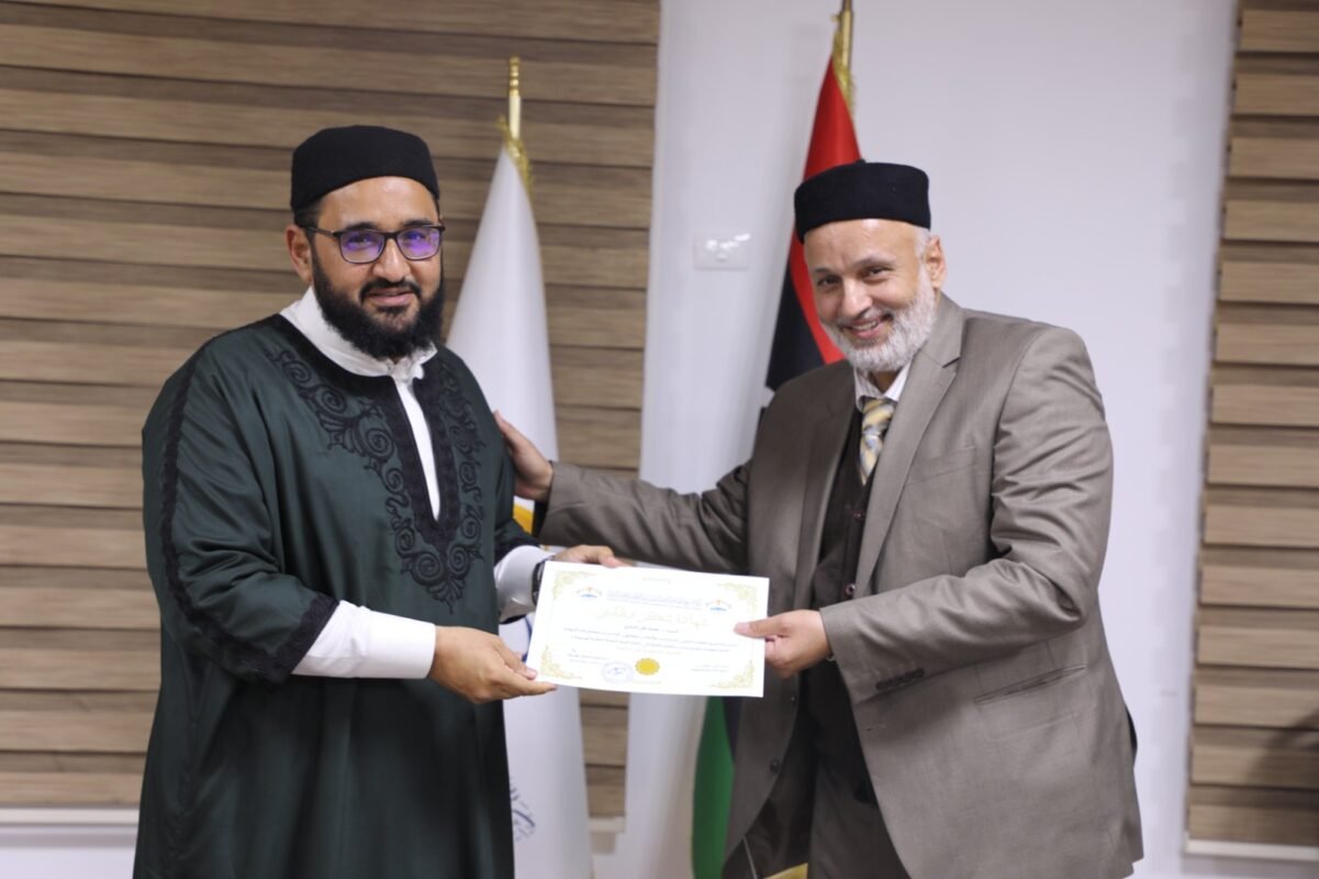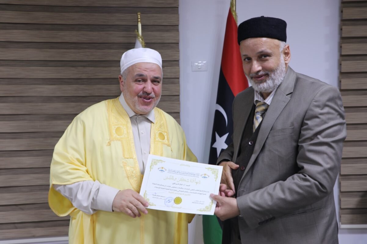 وفي ختام هذه التظاهرة العلمية الكبيرة، وتقديراً للجهود الأكاديمية المبذولة، قامت إدارة مركز الشيخ الطاهر الزاوي بتوزيع شهادات شكر وتقدير على كافة السادة المشاركين والمناقشين، عرفاناً بجهودهم العلمية ومشاركتهم الفعالة التي أسهمت بشكل مباشر في إنجاح هذه الندوة الحوارية وإخراجها بالصورة اللائقة التي تليق بمكانة المذهب المالكي، وبذكرى علم من أعلام الأمة الإسلامية.